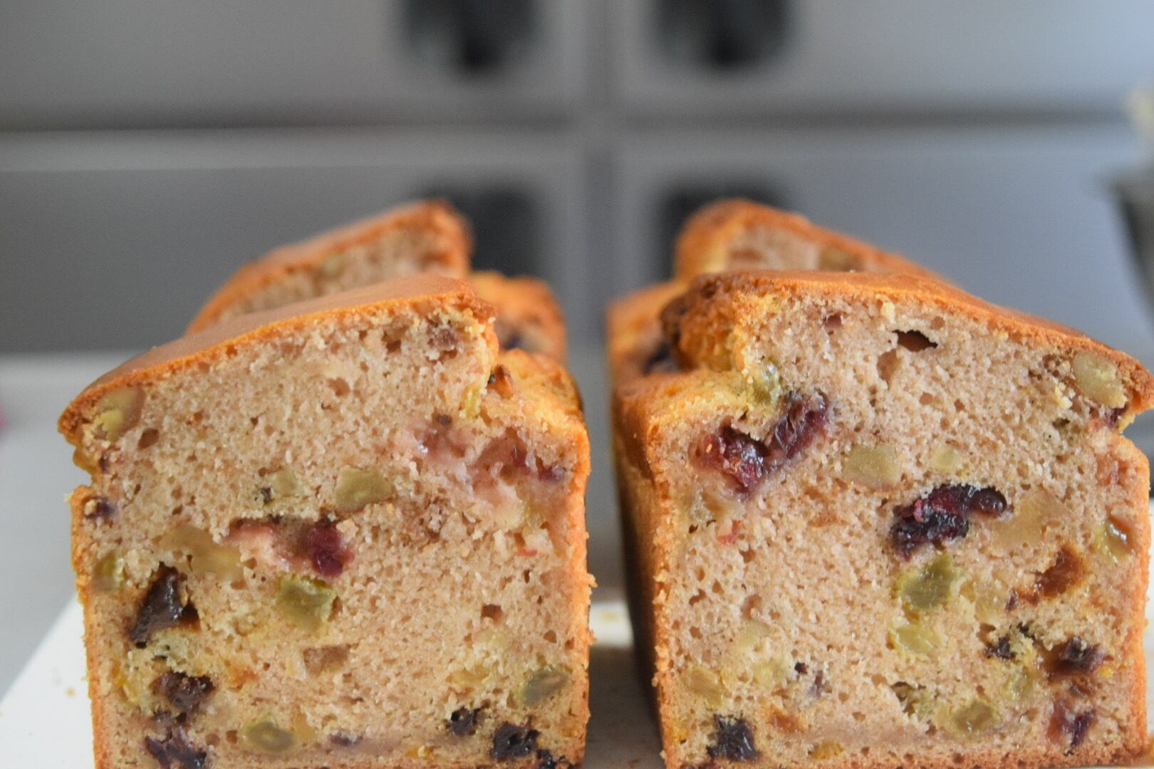 ほんのりシナモン生地にクルミ、グリーンレーズン、レーズン、柚ピール、クランベリーが入った食べ応えのあるクリスマス定番パウンドケーキ