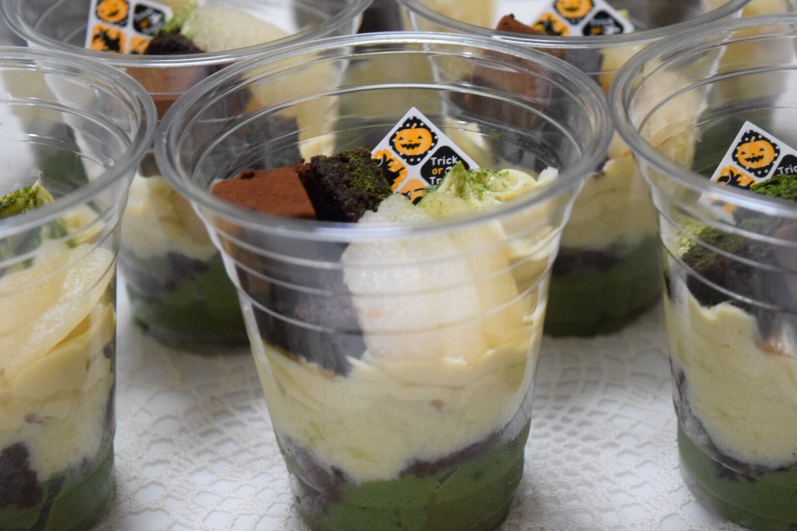 宇治抹茶使用のぷるぷる抹茶ブラマンジェ、豆乳ブラマンジェ、ココアスポンジ、減農薬梨のコンポート、ガトーショコラ、生チョコが入った贅沢パフェ!