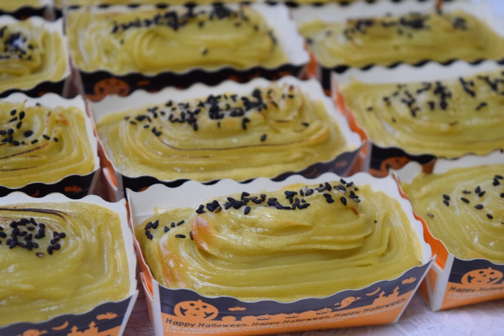 サツマイモ、減農薬和梨いりのスポンジにクリーミーなサツマイモクリームをのせて焼きました.